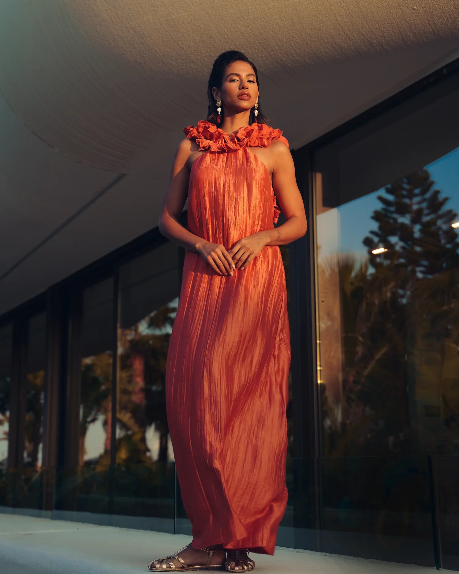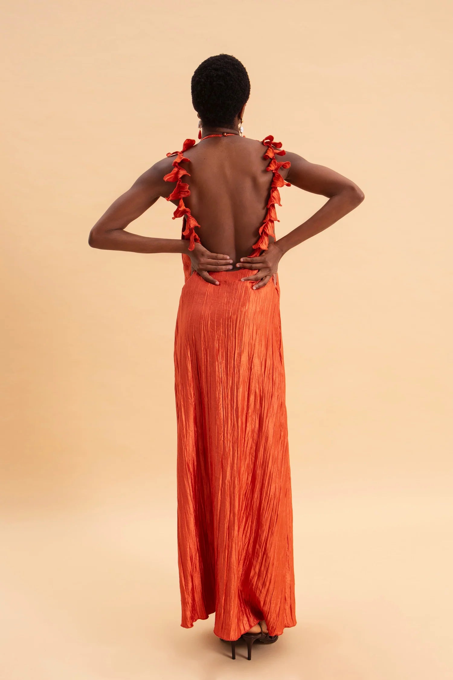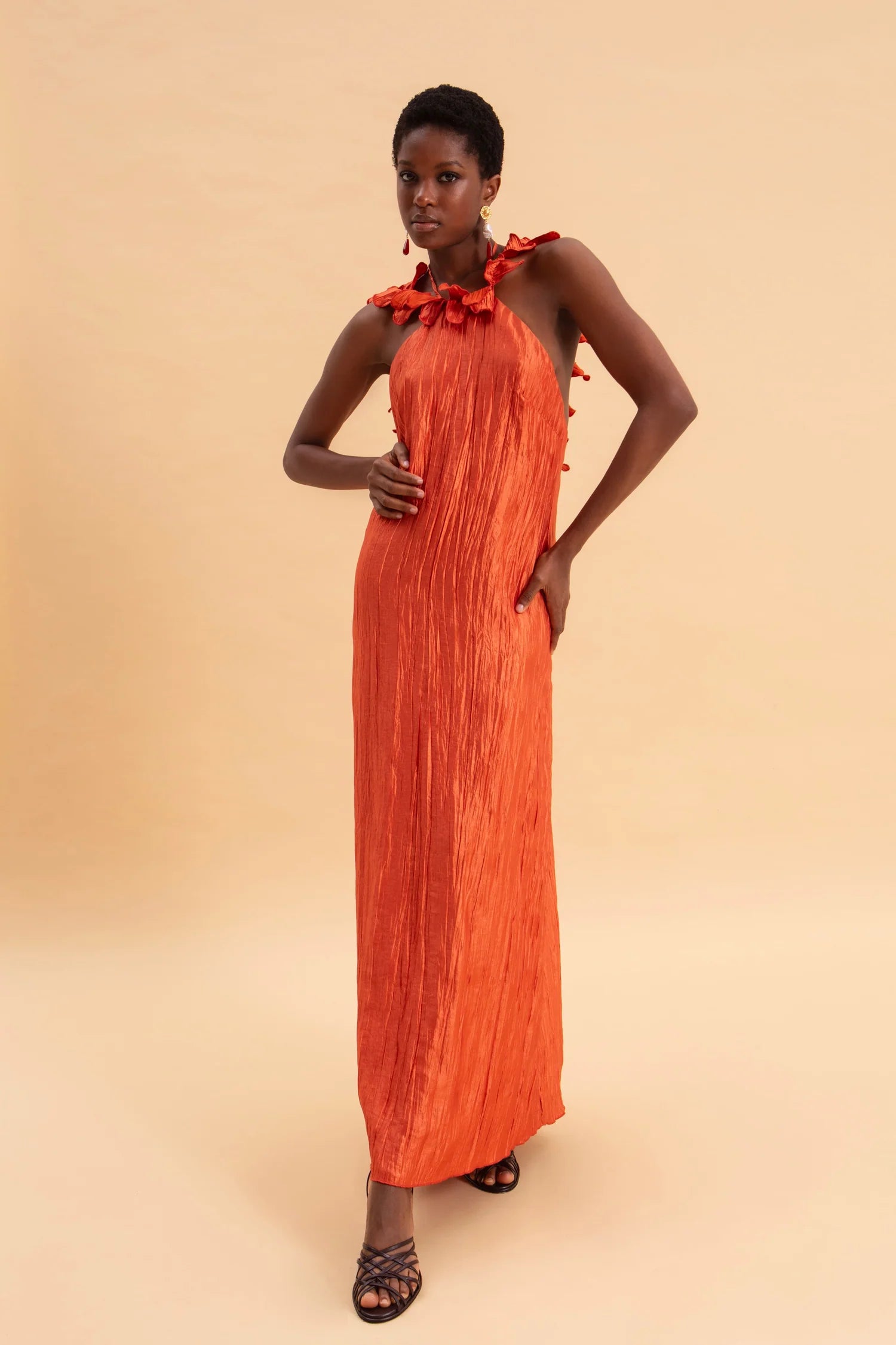 υτό το μάξι φόρεμα είναι μια εντυπωσιακή και καλλιτεχνική δημιουργία, ιδανική για ιδιαίτερες εμφανίσεις.Κατασκευασμένο από ανάλαφρο, πλισέ ύφασμα με σατινέ υφή που χαρίζει λάμψη και κομψότητα. Το ύφασμα έχει φυσική κίνηση και αγκαλιάζει το σώμα με διακριτικότητα.Έχει ίσια, μάξι γραμμή που αγκαλιάζει το σώμα χωρίς να το περιορίζει. Το μήκος του φτάνει ως το πάτωμα και δημιουργεί επιμήκυνση της σιλουέτας.Δένει στον λαιμό τύπου halter, αφήνοντας τους ώμους και την πλάτη εντελώς ακάλυπτα, προσθέτοντας μια αισθησιακή και ανάλαφρη πινελιά.Η εντυπωσιακή ανοιχτή πλάτη αναδεικνύεται με μοναδικά χειροποίητα διακοσμητικά φύλλα από το ίδιο ύφασμα, τα οποία κατεβαίνουν κατά μήκος του ανοίγματος δημιουργώντας μια γλυπτική, σχεδόν καλλιτεχνική λεπτομέρεια.Βαθύ πορτοκαλί-τερακότα που φωτίζει την επιδερμίδα και αποπνέει θέρμη, φρεσκάδα και θηλυκότητα.Ένα φόρεμα που συνδυάζει ρομαντισμό, θεατρικότητα και καλοκαιρινή φινέτσα με ιδιαίτερες σχεδιαστικές λεπτομέρειες.