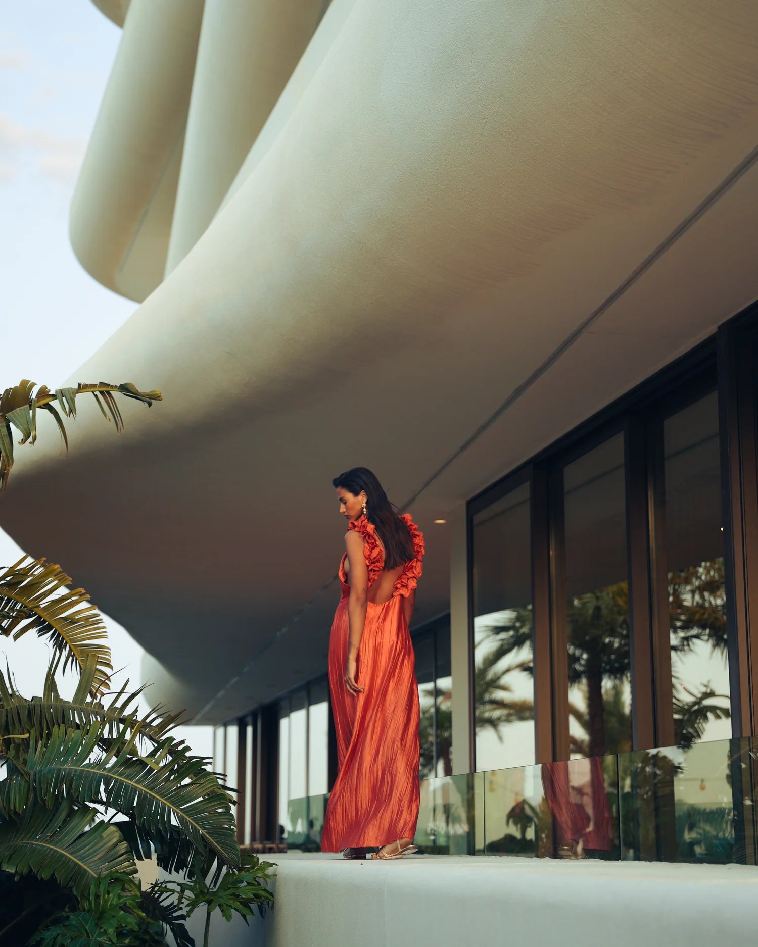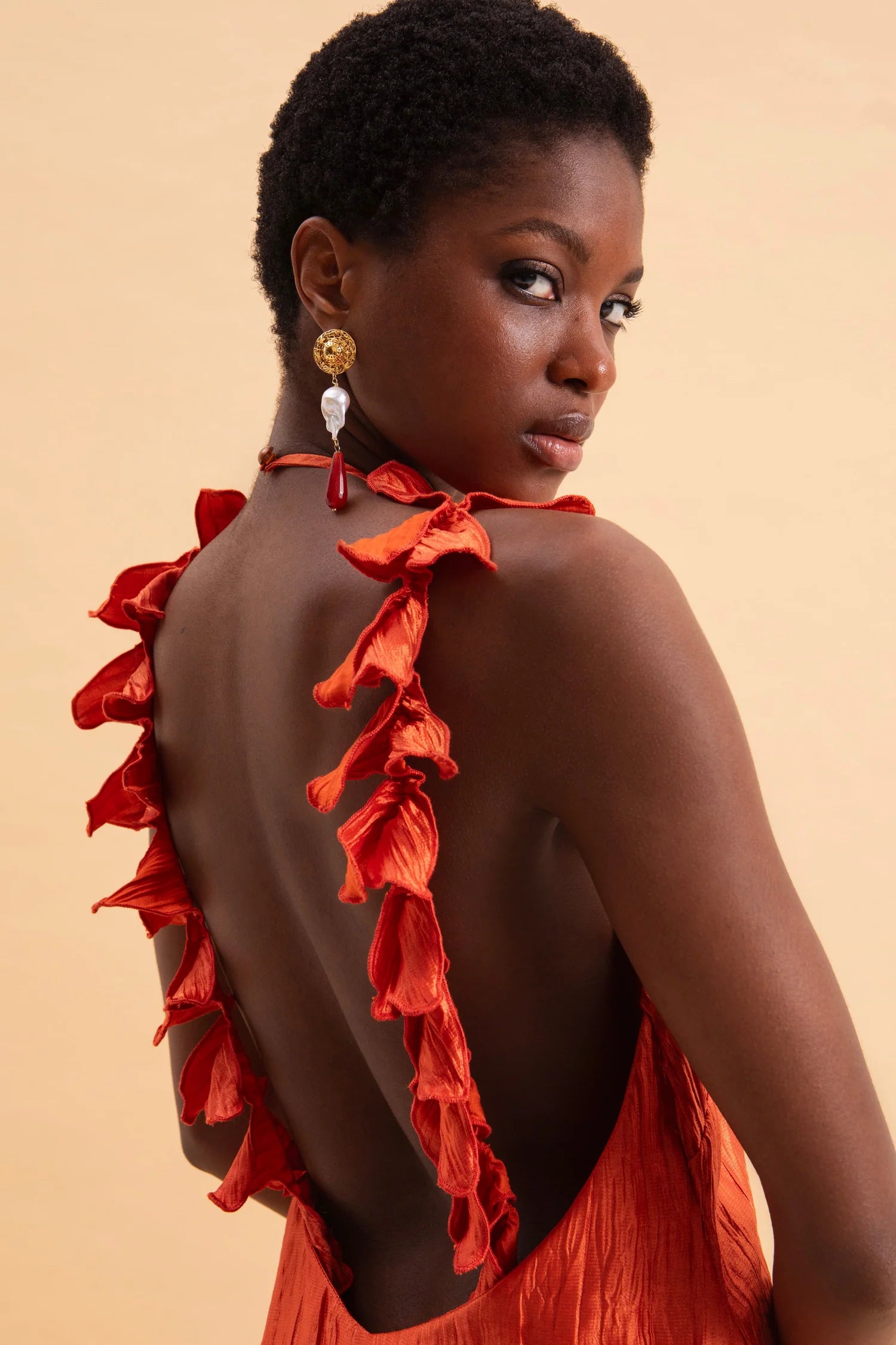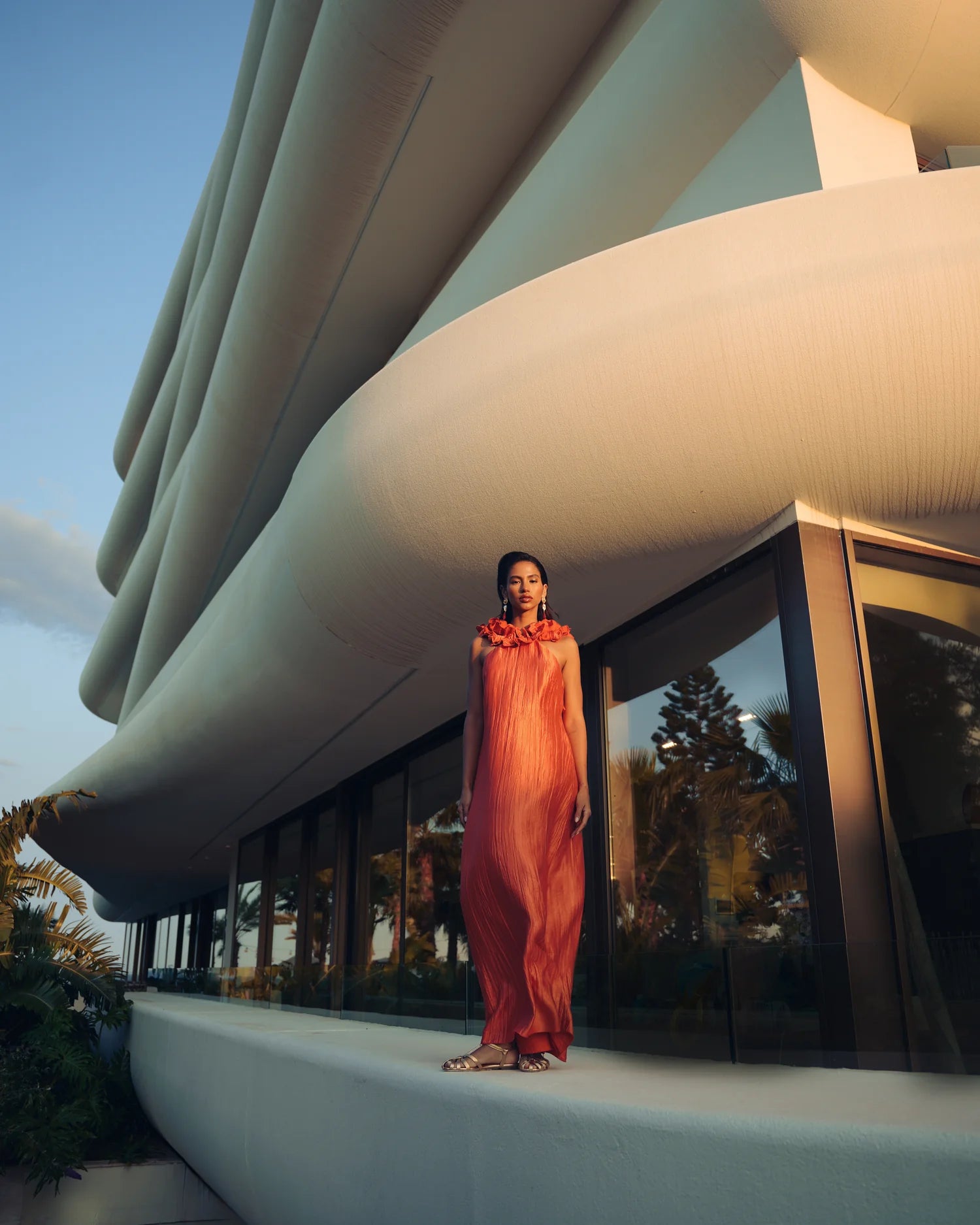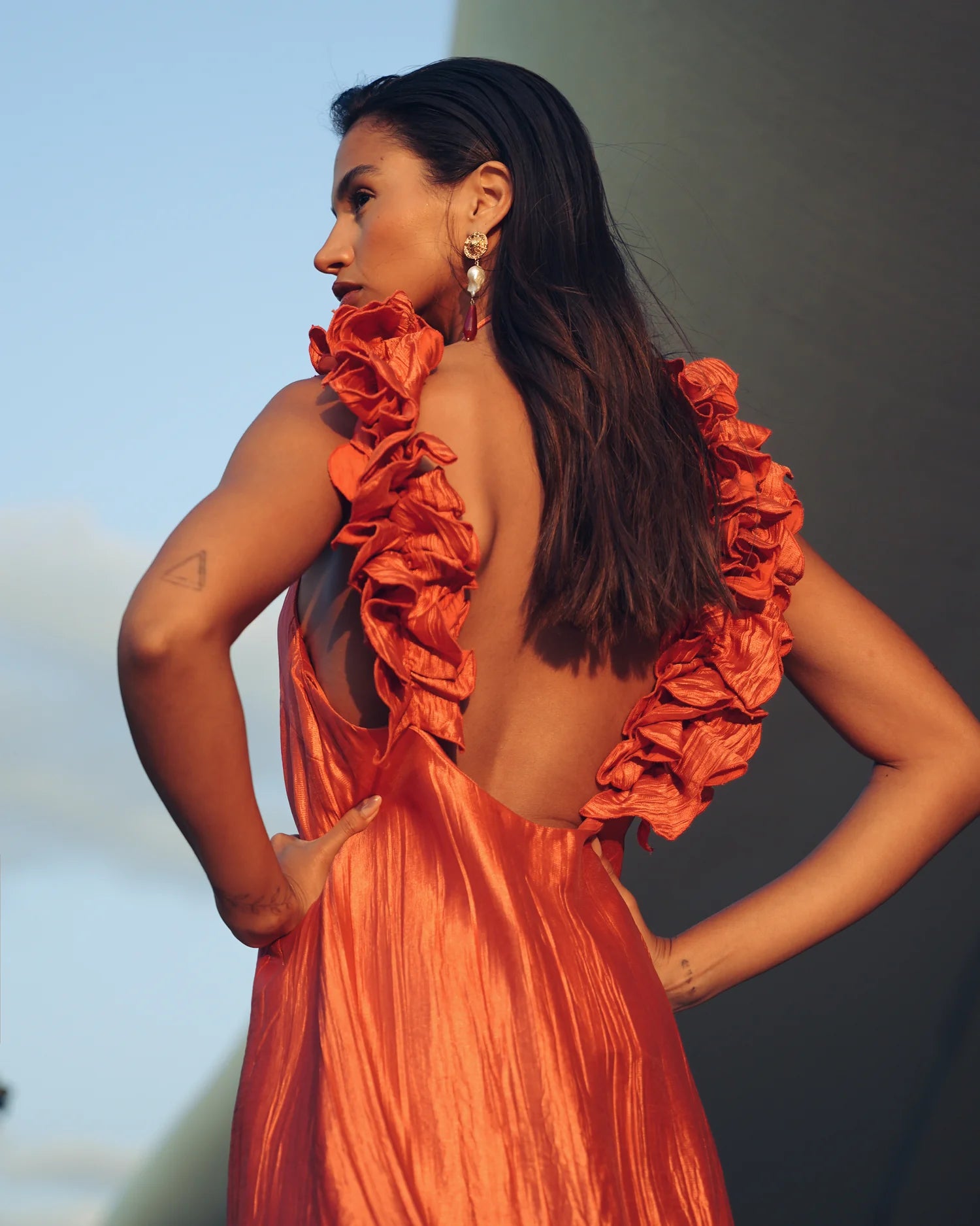 υτό το μάξι φόρεμα είναι μια εντυπωσιακή και καλλιτεχνική δημιουργία, ιδανική για ιδιαίτερες εμφανίσεις.Κατασκευασμένο από ανάλαφρο, πλισέ ύφασμα με σατινέ υφή που χαρίζει λάμψη και κομψότητα. Το ύφασμα έχει φυσική κίνηση και αγκαλιάζει το σώμα με διακριτικότητα.Έχει ίσια, μάξι γραμμή που αγκαλιάζει το σώμα χωρίς να το περιορίζει. Το μήκος του φτάνει ως το πάτωμα και δημιουργεί επιμήκυνση της σιλουέτας.Δένει στον λαιμό τύπου halter, αφήνοντας τους ώμους και την πλάτη εντελώς ακάλυπτα, προσθέτοντας μια αισθησιακή και ανάλαφρη πινελιά.Η εντυπωσιακή ανοιχτή πλάτη αναδεικνύεται με μοναδικά χειροποίητα διακοσμητικά φύλλα από το ίδιο ύφασμα, τα οποία κατεβαίνουν κατά μήκος του ανοίγματος δημιουργώντας μια γλυπτική, σχεδόν καλλιτεχνική λεπτομέρεια.Βαθύ πορτοκαλί-τερακότα που φωτίζει την επιδερμίδα και αποπνέει θέρμη, φρεσκάδα και θηλυκότητα.Ένα φόρεμα που συνδυάζει ρομαντισμό, θεατρικότητα και καλοκαιρινή φινέτσα με ιδιαίτερες σχεδιαστικές λεπτομέρειες.