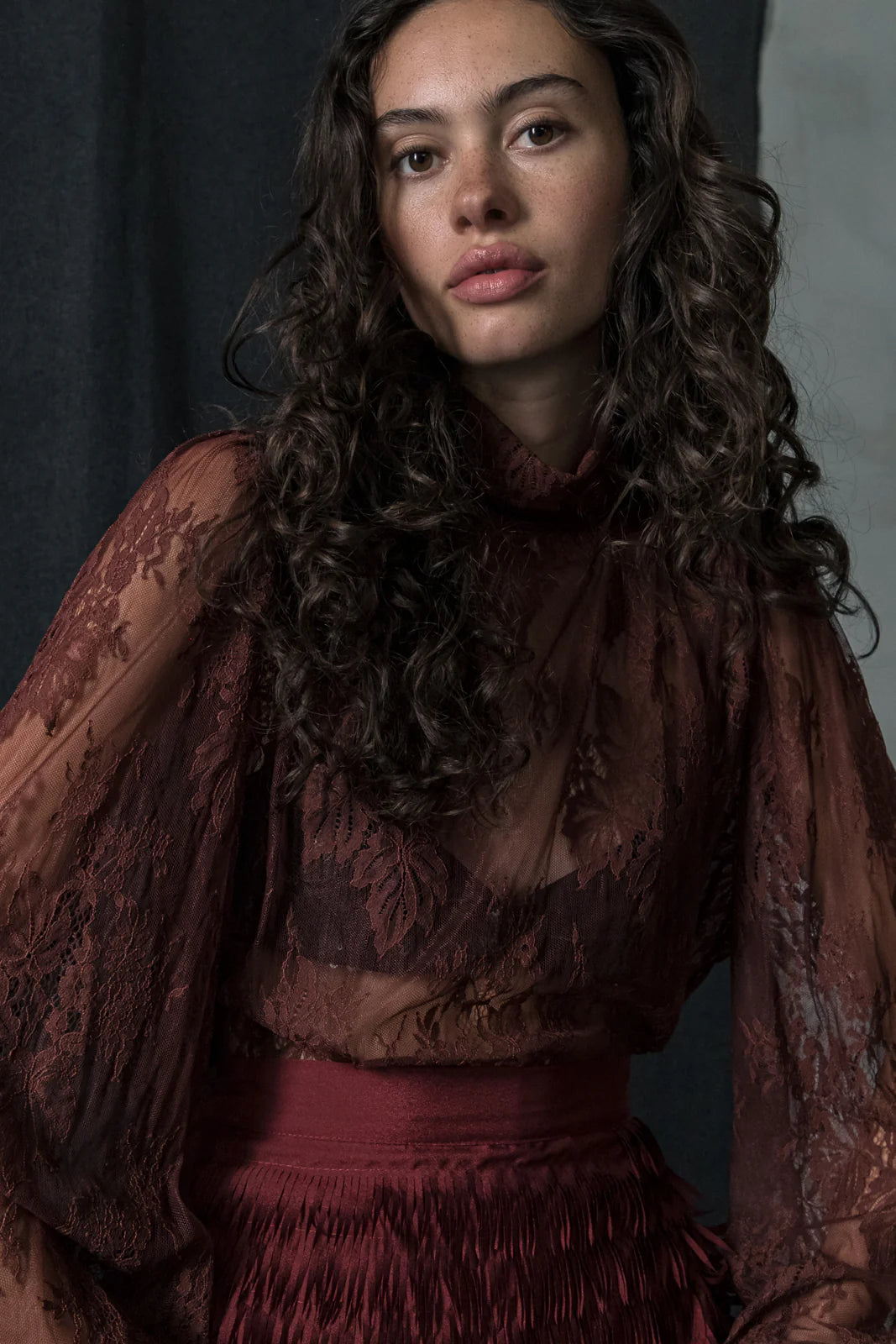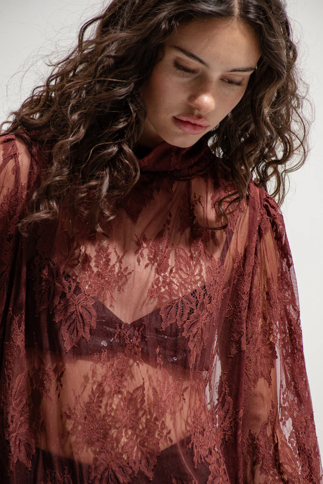 Sensual, effortless and unapologetically bold. This sheer burgundy lace mini dress combines romance with The Jerkins’ signature attitude. Designed with a relaxed silhouette, voluminous sleeves and a soft draped neckline, it’s a versatile layering piece that moves between elegance and rebellion — pair it with bralettes, shorts or slip dresses for an elevated statement.