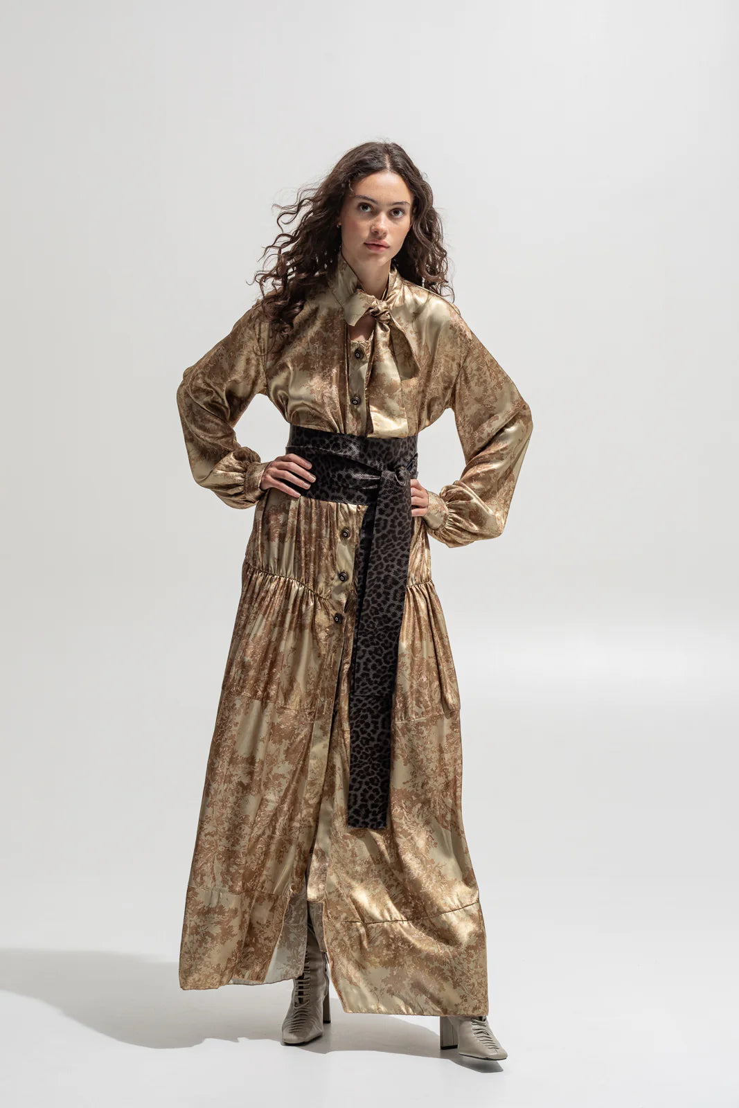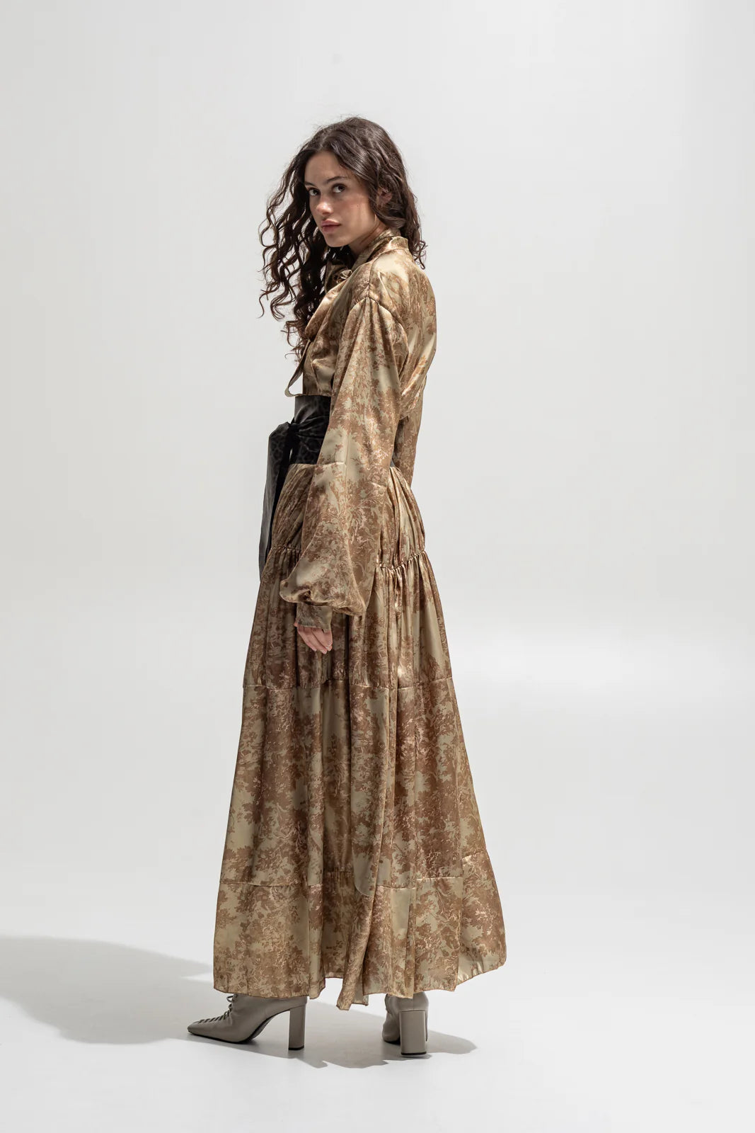 Elevate your wardrobe with this flowing satin maxi dress, featuring a delicate vintage-inspired print in warm earthy tones. Designed for effortless sophistication, it showcases a bow-tie neckline, front button closure, and voluminous long sleeves with structured cuffs. The tiered silhouette creates graceful movement, while the lustrous fabric enhances its luxurious appeal.