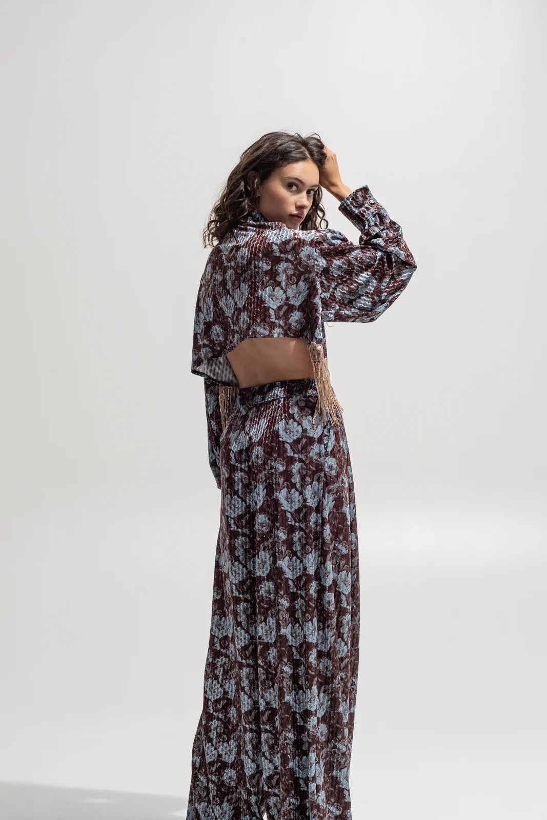 The velvet floral wide-leg pants in deep burgundy and ice blue tones bring a luxurious texture and effortless movement.